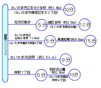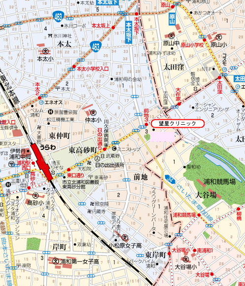 JR浦和駅東口を出て、日の出通りを越谷方面へ約10分。 前地3丁目バス停前。