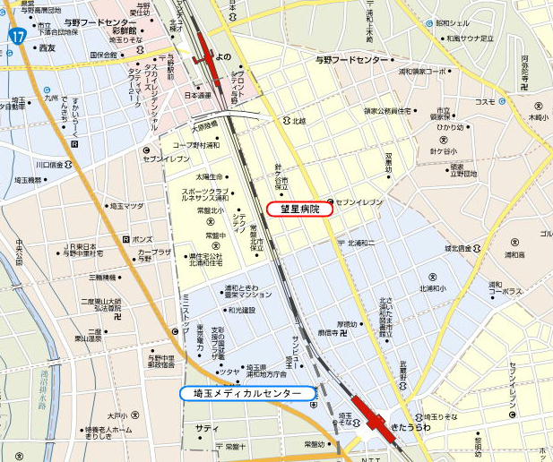 JR北浦和駅東口を出て、旧中仙道を大宮方面へ徒歩約10分。 JR与野駅東口を出て、旧中仙道を浦和方面へ徒歩約10分。