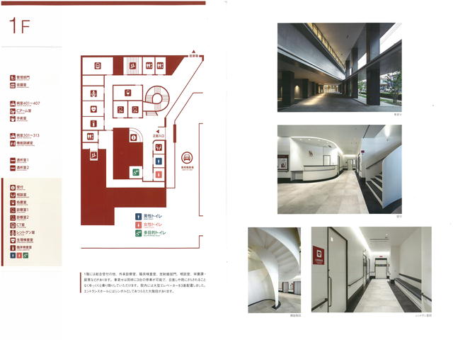 1階には総合受付の他、外来診察室、臨床検査室、放射線部門、相談室、栄養課・厨房などがあります。