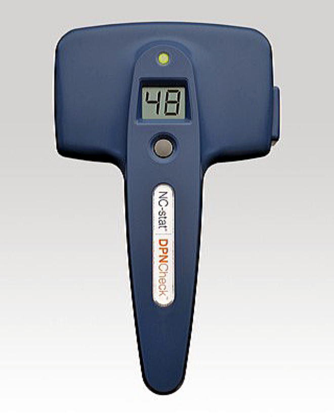 末梢の感覚神経の一つであるひ腓腹(ひふく)神経に電気刺激を与え、神経に興奮が伝わる速度(神経伝導速度)と大きさ(活動電位振幅)を測定し、DPNの程度を簡便に検査する神経伝導検査装置です。〒243-0013